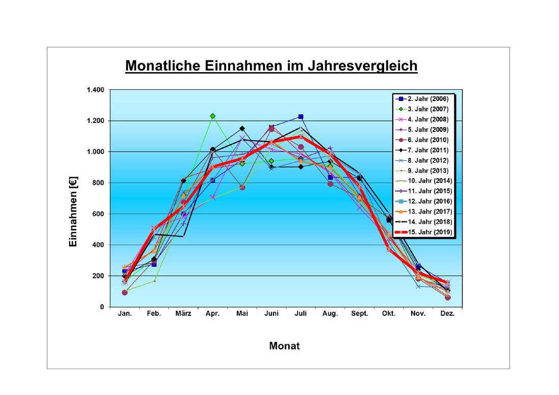Die Grafik dokumentiert die Stromverläufe für jedes Betriebsjahr der Anlage. Man erkennt sehr gut den charakteristischen Jahresverlauf einer PV-Anlage und stellt fest, dass die Monate Mai bis August den "Löwenanteil" der Stromerzeugung stemmen, während die Leistungskurve im restlichen Jahr steil abfällt. Auch ganz interessant: Aus den Werten können Sie sehr gut Rückschlüsse ziehen über die unterschiedlichen Sonnenintensitäten in den jeweiligen Jahren; so hebt sich z.B. der "Jahrhundert-April" von 2007 oder der besonders "sonnenreiche" Sommer im Jahr 2011 deutlich hervor.