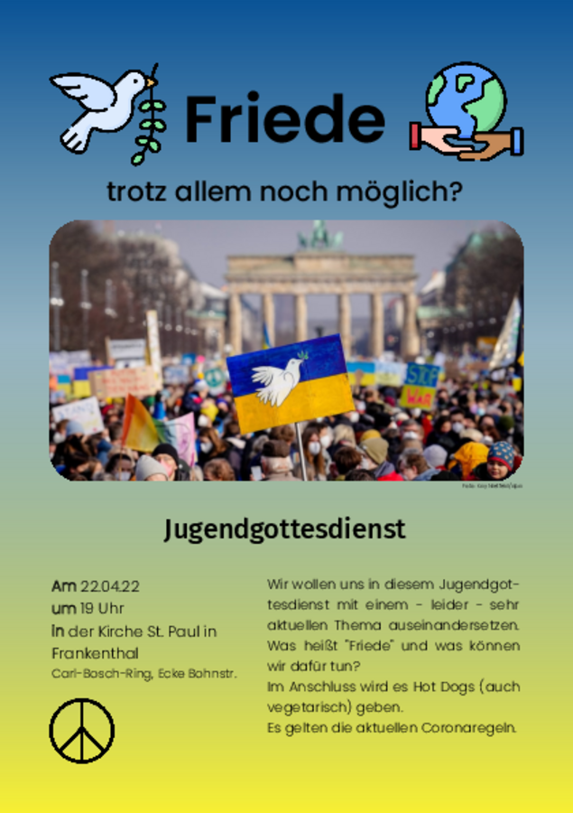 Unter dem leider sehr aktuellen Thema "Friede - trotz allem noch möglich?" steht ein Jugendgottesdienst, der am 22.04., 19:00 Uhr, in der Kirche St. Paul (Carl-Bosch-Ring / Ecke Bohnstr.) gefeiert wird. Schockiert durch den Krieg in der Ukraine, hat sich das Jugo-Team, bestehend aus Jugendlichen aus der Pfarrei, Gedanken zum Thema Frieden gemacht und möchte auch die jungen Besucherinnen und Besucher anregen, sich eigene Gedanken zu machen. Dabei wird es selbstverständlich keine Patentlösungen für den Frieden in der Welt geben, aber doch Anregungen dafür, was der oder die einzelne zum Frieden beitragen kann.