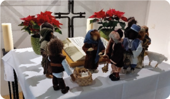 Leuchtende Augen und erwartungsfrohe Gesichter schauten in der vollbesetzten Kapelle des Hieronymus-Hofer-Hauses in Richtung Altar bei der ökumenischen Christmette. Bereits zum zweiten Mal haben Pfarrerin Sigrid Schramm und Diakon Andreas W. Stellmann die Bewohnerinnen und Bewohner eingeladen, gemeinsam den Gottesdienst zu feiern. Natürlich stand die Weihnachtsgeschichte aus der Lutherbibel im Mittelpunkt und wurde während der Predigt von Diakon Stellmann mit biblischen Erzählfiguren, die uns Pfarrer Michael Baldauf aus Hessheim zur Verfügung gestellt hatte, durch Pfarrerin Schramm in Szene gesetzt. Und natürlich durften auch die bekannten